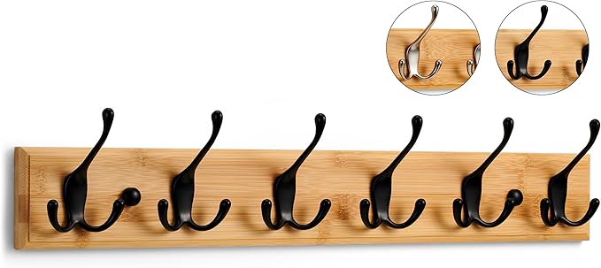 Diese Garderobenleiste ist die ideale, langlebige Lösung, um Ordnung im Flur zu schaffen und Ihre schwersten Kleidungsstücke sicher aufzuhängen. Sie kombiniert Bambus und Holz mit einem stabilen Metallgestell und ist für eine maximale Last von 30 kg ausgelegt. Die Leiste verfügt über drei-fach-Haken (insgesamt 6 Haken), die eine hohe Kapazität bieten. Die Nachhaltige Kleiderhaken wird mit Schraubkappen geliefert, die eine nahtlos klare und elegante Optik garantieren. Sie ist perfekt für Flur, Eingang, Schlafzimmer oder Bad geeignet und lässt sich einfach befestigen.
