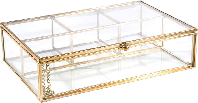 Diese dekorative Box ist das ideale Accessoire, um Ihre Ringe und Accessoires elegant in Szene zu setzen. Die Konstruktion kombiniert langlebiges Messing mit klarem Glas und einem verspiegelten Boden, der Ihre Schmuckstücke optimal in Szene setzt. Der Vintage-Stil und die rechteckige Form fügen sich perfekt in das Badezimmer oder Schlafzimmer ein. Die Nachhaltige Schmuckkästchen enthält vier Fächer, die eine übersichtliche Trennung ermöglichen und die Gefahr von Kratzern durch Aneinanderreiben minimieren.