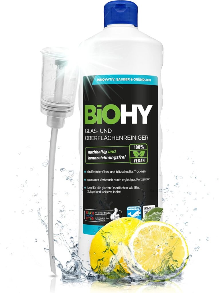 - Das BiOHY Glasreiniger-Konzentrat sorgt für streifenfreien Glanz und ist extrem ergiebig.