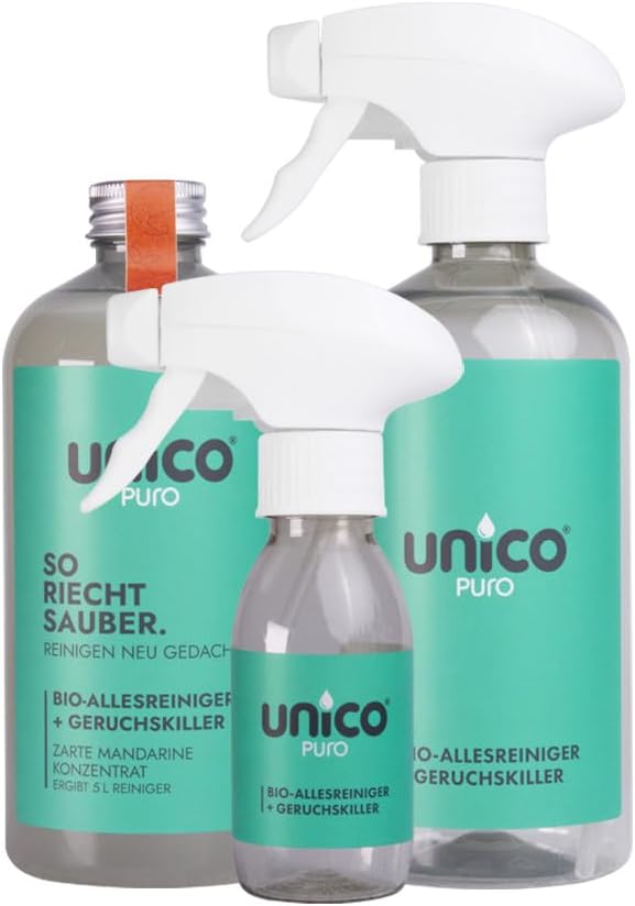 Das System von unicopuro ist eine geniale Lösung, um Plastikmüll und Transportgewicht zu vermeiden. Statt zehn voller Flaschen kaufst du nur ein kleines Fläschchen mit einem hochwirksamen Konzentrat. Zu Hause mischst du einfach eine kleine Menge mit Wasser in der mitgelieferten, wiederverwendbaren Sprühflasche. Das in Deutschland hergestellte Konzentrat basiert auf natürlichen Inhaltsstoffen und effektiven Mikroorganismen. Dieses nachhaltiger Allzweckreiniger ist komplett biologisch abbaubar und extrem ergiebig.