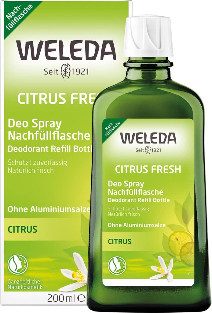 Die Naturkosmetik-Marke Weleda geht den nachhaltigsten Weg: Statt immer neue Pumpzerstäuber zu kaufen, bietet sie ihr beliebtes Citrus-Deo in einer großen Nachfüllflasche aus Glas an. Das spart enorm viel Verpackungsmüll. Die Formel mit reinen ätherischen Ölen wirkt mild desodorierend, ohne die Poren zu verschließen, und kann sogar als erfrischendes Körperspray verwendet werden.