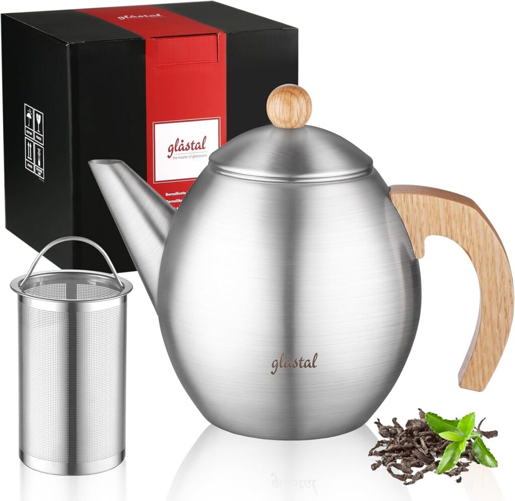 glastal Edelstahl Teekanne – 1,2 L Doppelwand, ultrafeines Edelstahl-Sieb, Holzgriffe