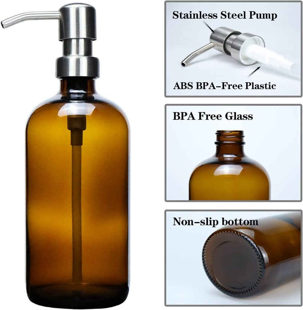 Wer sein Spülmittel selber machen möchte, braucht eine langlebige und schöne Flasche zur Abfüllung. Dieser Spender aus dickem Amber-Glas ist die perfekte Wahl, um die Plastikflut unter der Spüle zu beenden. Die Flasche ist wiederverwendbar und aus hochwertigem, bleifreiem Glas gefertigt. Der Pumpenkopf besteht aus rostfreiem 304 Edelstahl, was die Langlebigkeit garantiert und für eine besonders ästhetische Optik sorgt, die in jede moderne, nachhaltige Küche passt. Mit 500 ml Füllmenge ist sie ideal für die Dosierung des selbstgemachten Spülmittels.
